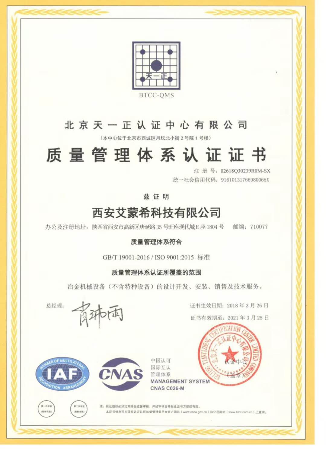 質量管理體系認證證書